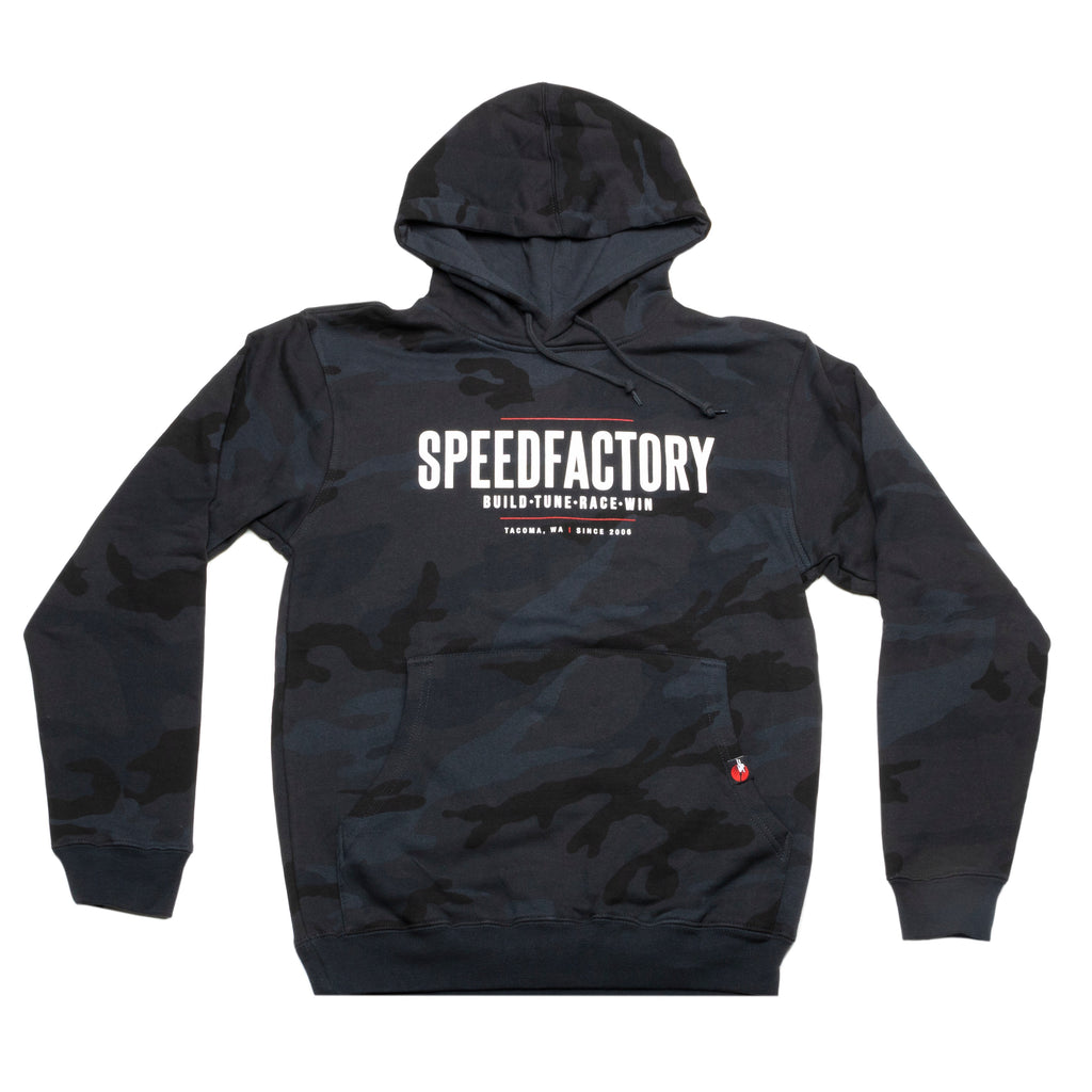 The SpeedFactory Racing BTRW (BUILD-TUNE-RACE-WIN) Hoodie in black camo!