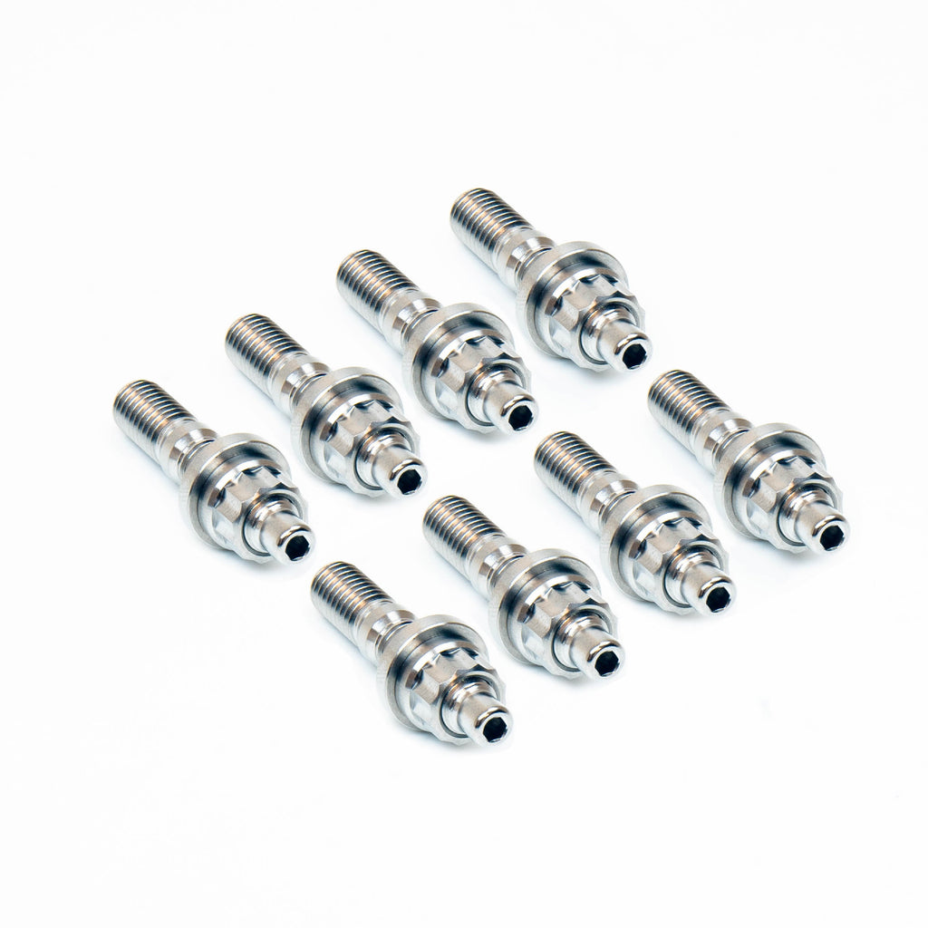 Titanium is ~45% lighter, stronger, and will not corrode like your stock steel bolts or studs. Each stud/washer/nut assembly weighs only 12g!